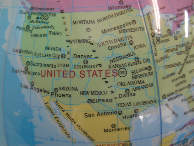 地球儀に付いている、距離表示で紐の長さを測ります。